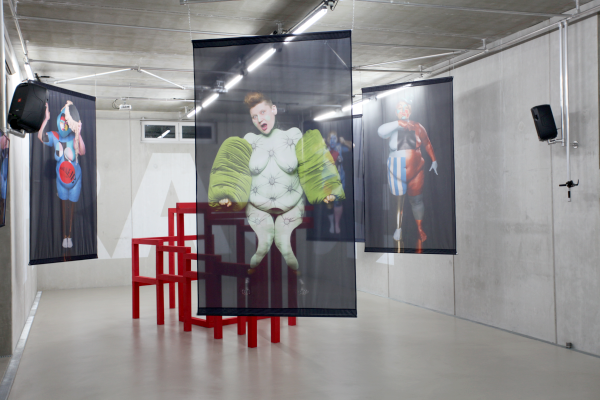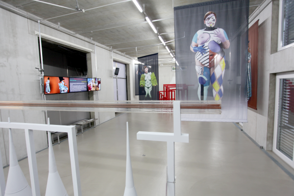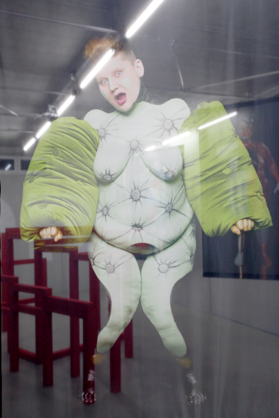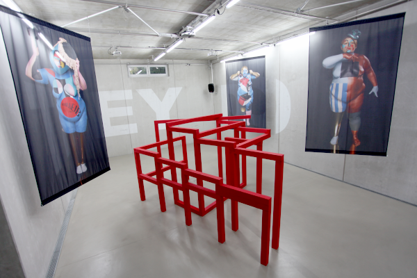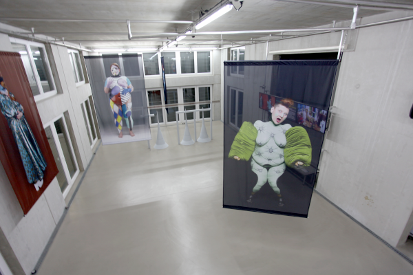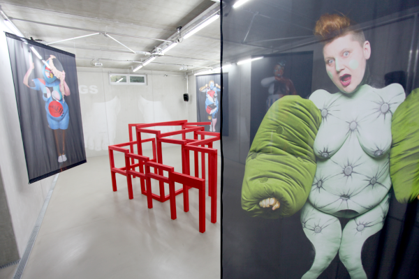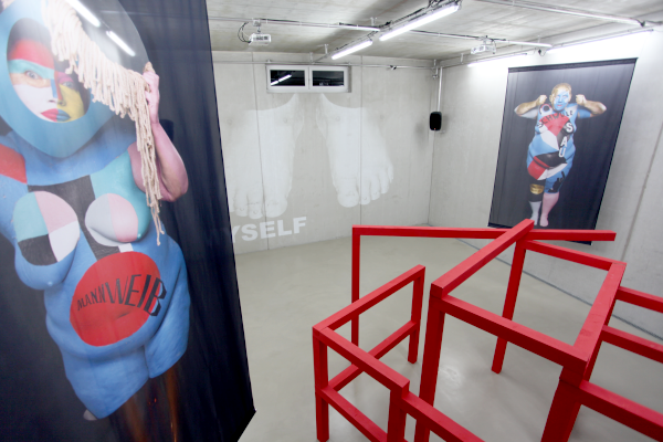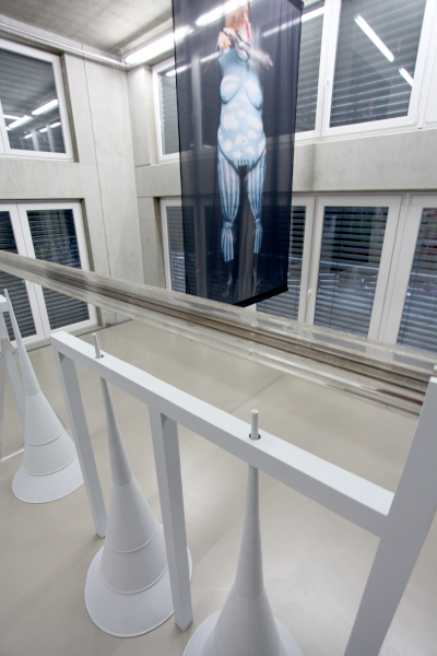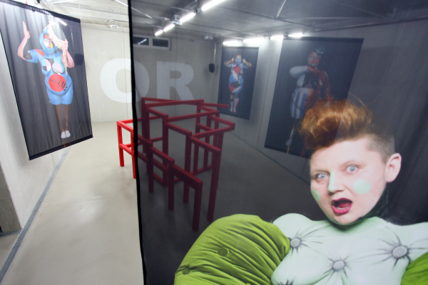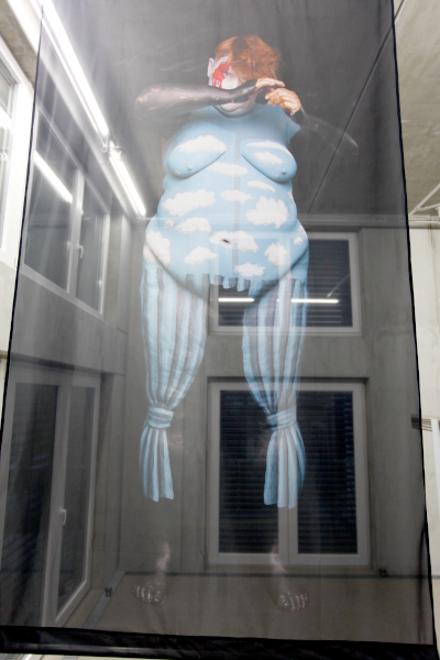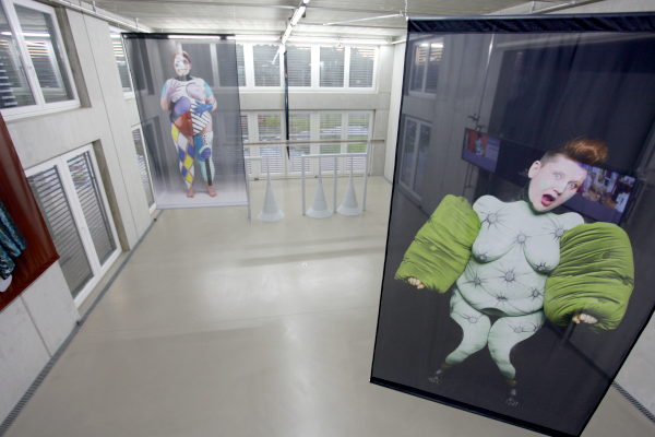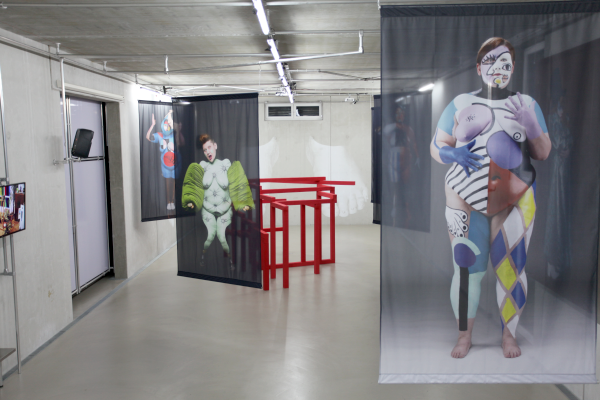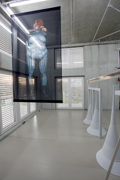 Es war Graf/ZYXs Idee, diese Fotos von Lenas Körperbemalungen auf transparenten Fahnenstoff zu montieren und in Bahnen von der Decke hängen zu lassen. Überhaupt dürfen Graf/ZYX als die Dritten im Bunde auf keinen Fall außer Acht gelassen werden. Weit über die Grundidee zu „Strategische Komplemente“ und die Auswahl der Künstler hinaus ist ihre kuratorische Arbeit – die subtile Werkauswahl sowie ihr Beitrag zum Arrangement im Raum – ganz entscheidend.