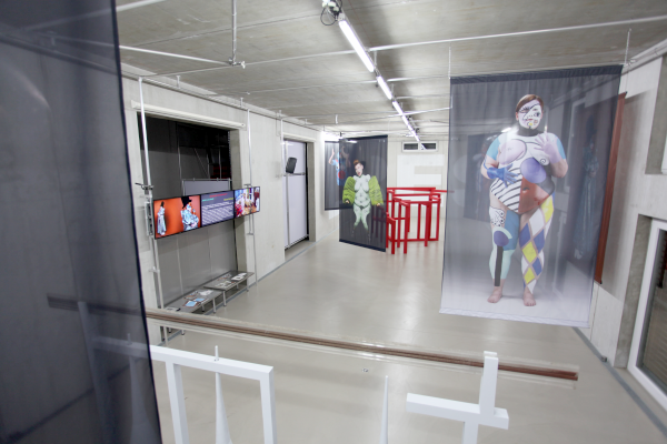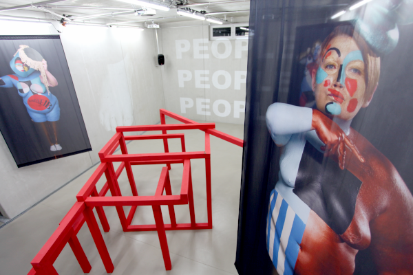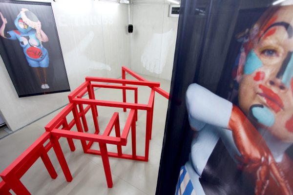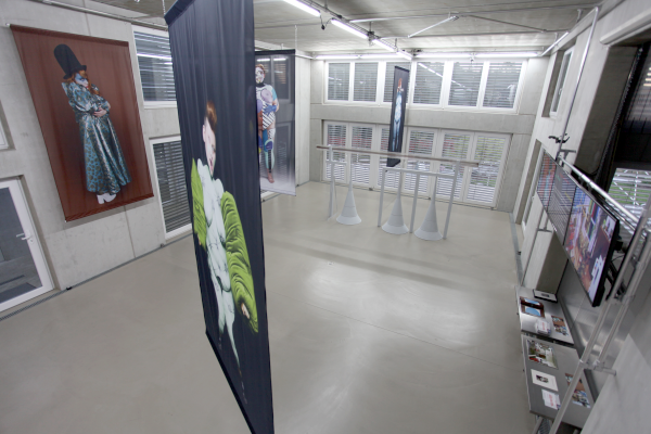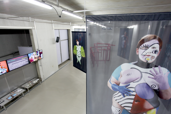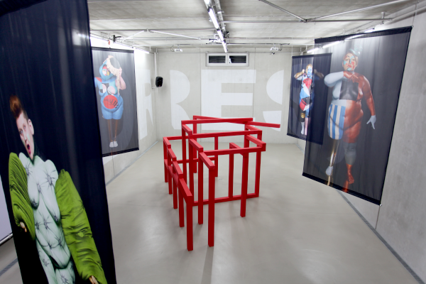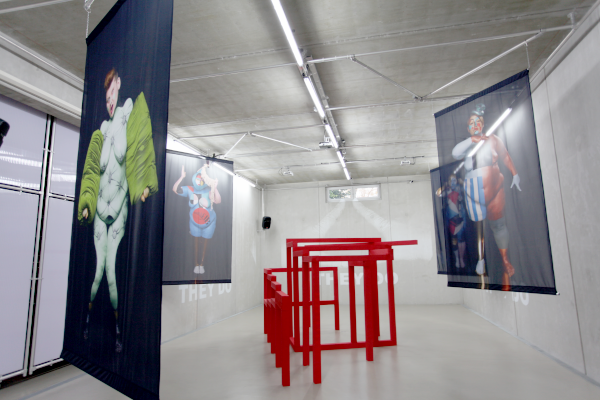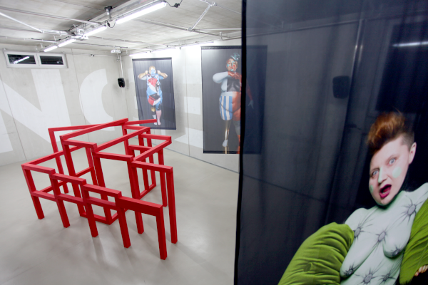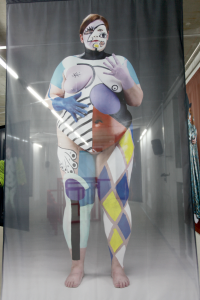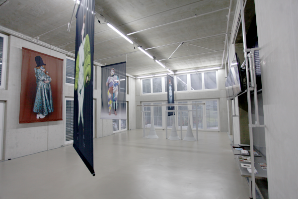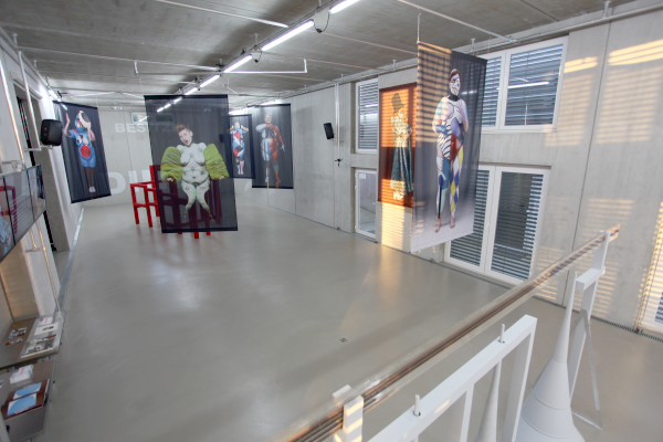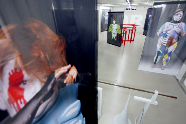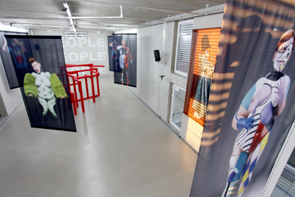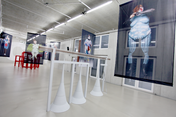 Es war Graf/ZYXs Idee, diese Fotos von Lenas Körperbemalungen auf transparenten Fahnenstoff zu montieren und in Bahnen von der Decke hängen zu lassen. Überhaupt dürfen Graf/ZYX als die Dritten im Bunde auf keinen Fall außer Acht gelassen werden. Weit über die Grundidee zu „Strategische Komplemente“ und die Auswahl der Künstler hinaus ist ihre kuratorische Arbeit – die subtile Werkauswahl sowie ihr Beitrag zum Arrangement im Raum – ganz entscheidend.