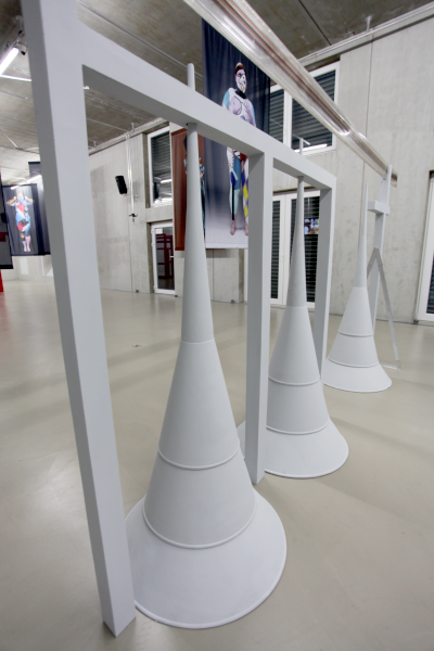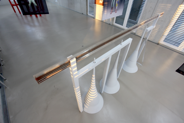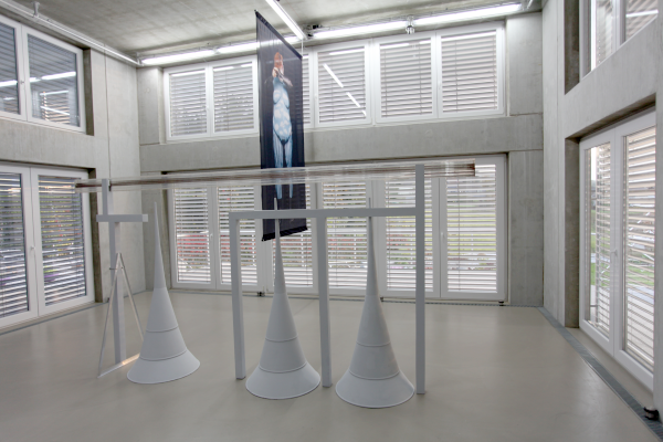 Die zweite Arbeit, die Graf/ZYX ebenso gezielt für die Ausstellung im TANK auswählten, ist eines der eher seltenen Beispiele, wo sich in Würtingers sonst prinzipiell abstraktes Werk gegenständlich assoziierbare Formen mischen. Es handelt sich um ein Gerüst aus Holz, als Gestell und Rahmen für zarte trichterförmige Gebilde aus Polyester, die an Musikinstrumente, aber auch an Vorrichtungen zum Hören denken lassen. Jeder wird diese Körper anders lesen, aufschlussreich für sein Denken ist aber die (mir nur fragmentarisch angedeutete) Erklärung des Künstlers. Demnach ließ er sich von Trichtern inspirieren, wie sie etwa im ersten Weltkrieg verwendet wurden, um in den Boden hineinzuhören und über feine Erschütterungen die Position beziehungsweise das Nahen des Feindes festzustellen. Davon anschließend spekulierte er – wie er selbst sagt, durchaus in einem populärwissenschaftlichen Sinne – generell über die Möglichkeit in belebte und unbelebte Dinge hineinzuhorchen und damit etwa den „inneren Klang“ eines Steines ebenso erlauschen zu können, wie vielleicht den eines Menschen.