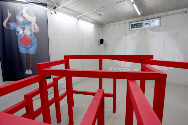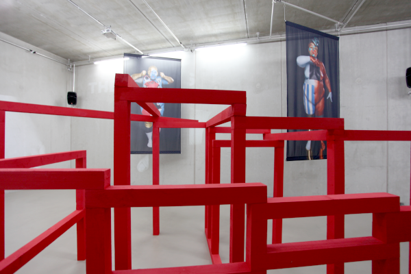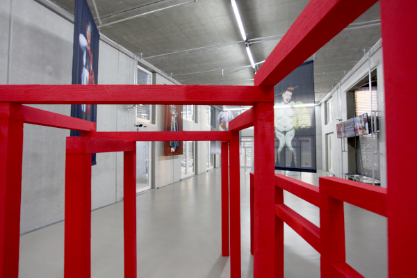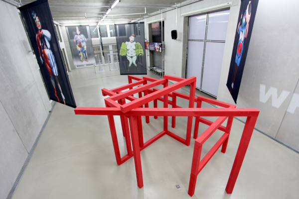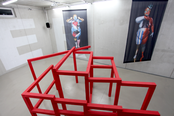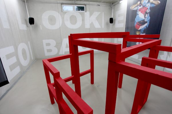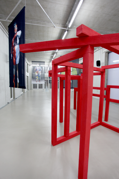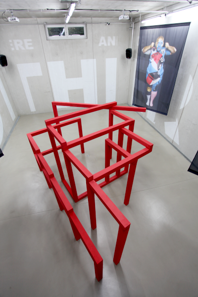 Ein schönes Beispiel ist die auf ausdrücklichen Wunsch von Graf/ZYX im TANK ausgestellte, rot bemalte Holzkonstruktion. Nicht nur ihre Materialität lässt an japanische Architekturen denken. Auch ihre diaphan ineinander geschachtelten Kompartimente gemahnen an dortige Konzepte, Räume nicht starr zu fixieren, sondern die Möglichkeit zu schaffen, diese mittels Schiebewänden für eine jeweilige Situation oder Verrichtung immer wieder anders zu begrenzen – und damit jeweils andere Befindlichkeiten zu erzeugen.