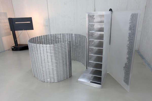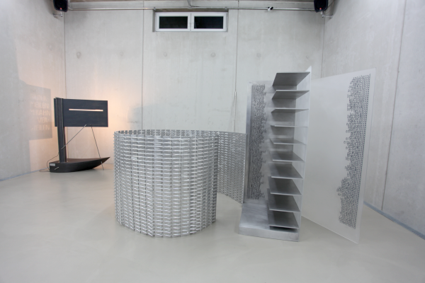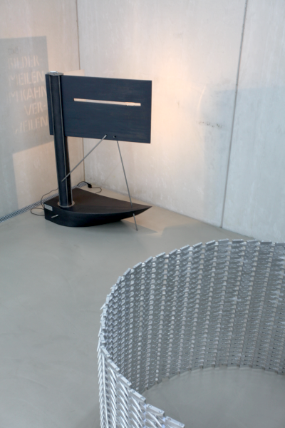 Seit 1990 entsteht auch die FIGUR/RAUM Serie, die sie nach dem griechischen Alphabet benennt, als Referenz auf einen Kulturraum „der uns vor allem in seinem philosophischen Denken geprägt hat“, so Meina Schellander. Die in der Ausstellung gezeigte RAUM-FIGUR ETA besteht aus mehreren korrelierenden, massiven, mehr oder weniger transparenten Aluminium- und Acrylglasplatten. Zwei Meter hohe, massive Wände stehen verwinkelt zueinander und sind kontrastierend mit negativen und positiven Inhalten von abblockend bis zerschmetternd und von annähernd bis zuwendend beschriftet. Die Wörter sind in einer Reihe ineinandergeschoben und bilden ein festes Netzgewebe, so dass erst ein genaues Hinschauen sie lesbar macht. Sprache als formales und inhaltliches Zeichen wird in den Raum gesetzt. In die zehn Schlitze sind massive Aluminiumlagen eingeschoben, die Schellander bewusst leer lässt, als ablesbare Freiräume, in die der Betrachter seine Gedanken legen kann – Denkräume an der Schwelle zwischen dem negativen Sprachfilm und den auf der dahinter in einem 34-Gradwinkel abstehenden Acrylwand stehenden positiven Begriffen. Die Balance zwischen der massiven, schweren Wand und einer größeren transparenten Leichtigkeit der dahinterstehenden Acrylwand bis hin zum sich in den Raum hinaus öffnenden Flügel ist Kernstück der Arbeit und in dieser sich bedingenden Gegensätzlichkeit auch Ausdruck der Persönlichkeit der Künstlerin: „Durch die Leichtigkeit der hinteren Wand erträgt sich das Schwere – diese Ambivalenz bin ich“. Am oberen Ende setzt Meina Schellander einen schwarzen Nylonschweif als ironisierendes Element. Bisher entstanden sind neben Raum-Figur Eta 1999-2004: Figur Alpha 1990 (Edition zu 12 Stk.), Raum Beta 1990, Raum Delta 1990, Raum Gamma, Figur Psi 1990, Figur Rho 1990, Figur Jota 1997, Figur Sigma/+ – Ortszeit 1997, Raum Omega 1999, Figur Zeta 1999-2003, Raum Kappa 1998 (Edition zu 4 Stk., Auftrag der Architekturstiftung Österreich). In der Ausstellung zeigt Schellander die Figur Epsilon, an der sie seit 1991 arbeitet und die stetiger Veränderung unterworfen ist, da ihr Pendant die Figur Omikron 1991 noch nicht als kongeniales Gegenüber zur Verfügung steht.