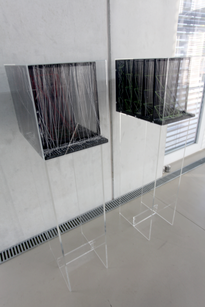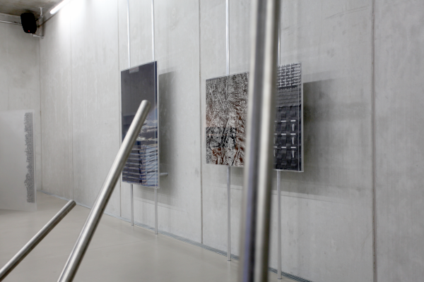 Das Sichtbarmachen eines sowohl räumlichen als auch zutiefst eigenen Empfindens von Innen und Außen ist immer wieder kehrendes Thema ihrer Arbeit, ebenso wie das dichte Geflecht, das sich zusammenballt, in Spiralen verdichtet und zuweilen zu einem undurchdringlichen Netzwerk wird. Auch im Sinne einer Verbundenheit zwischen Mensch und Natur. So bezeichnet Meina Schellander auch ihre Reihe der 1997 begonnenen Naturfotos als Identitätsmodelle ihrer eigenen Biografie. Den Fotos der Serie ZEIT-LAND-ANTEIL stellt Meina Schellander ab 2002 INNERE FREQUENZEN, Zeichnungen, gegenüber. Später kommen die Fotoarbeiten HIMMEL-LAND-ANTEIL hinzu. Der Zusatz „Innere Frequenz“ ist zugleich auch Rückverweis auf ihre Entstehung. Denn es ist kein Zueinanderfügen zweier einzelner Platten (Zeichnung und Foto) auf einen gemeinsamen Träger. Vielmehr reagiert die Künstlerin in ihren Zeichnungen auf die Fotografie, wobei formale Aspekte, als auch ihre innere Befindlichkeit in Auseinandersetzung mit der Fotografie gleichermaßen in die Zeichnung einfließen. Zunächst entstehen grafische Arbeiten in Schwarz-Weiß erst später kam die Farbe hinzu, sie ließ sich wie Meina Schellander formuliert, „dann gar nicht mehr aufhalten. Doch versuche ich auch mit der Farbe die Natur nicht zu übertrumpfen, die Balance zu halten und nur auf der formalen Ebene ein Kontra herzustellen.“. Die Vielfalt der Gedanken, meinte sie einmal sei ihr Auftraggeber, einige davon, die sich nicht abschütteln lassen, führt sie aus.3 Dies ist ebenso auf die Unerschöpflichkeit der möglichen Formenwelt der Zeichnungen übertragbar. Charakteristisch sind die stets bewusst gesetzten Brüche im Bild, der Kanal, dessen offene Durchlässigkeit durch ein Spiralenknäuel versperrt wird, oder das scheinbar seiner geometrischen Ornamentik in steter Aneinanderreihung gehorchende Muster, vor dem sich ein Schlingenraum entfaltet um dann jäh von schwarzen Tangenten durchpflügt zu werden. Alles Glorifizierende, Einfache ist ihr fern, die Ansätze einer formalen Ästhetik zu durchbrechen ist ihr wichtig: „Denn es braucht den Streit und die Auseinandersetzung, es gibt den Makel und das Scheitern als existenzielle, menschliche Komponente, die stets vorhanden ist.“ Scheint die Arbeit fertig zu sein, sucht die Künstlerin einen zeitlichen Abstand davon, um dann erneut in die Auseinandersetzung mit dem Werk zu treten und gegebenenfalls nochmals in den künstlerischen Prozess einzutauchen. Einige Formen drängen hervor, Motive werden, wie sie es bezeichnet, zu vordergründig und die Zeichnung daher überarbeitet, um eine Balance zu finden: „Nichts darf schillern oder hervortreten. Es muss ein neutraler Zustand erreicht werden, ähnlich wie bei dem Grasdickicht, wo es auch nichts gibt, woran das Auge des Betrachters sich festmachen kann – ich versuche eine Art neutralen Zustand herzustellen.“ Das Liebliche, Weiche der Natur ist ihr fremd. Die Fotos zeigen daher auch nicht das sich im Wind sanft wiegende Feld, sondern das dichte, undurchdringliche Grasbündel, dass sich schlingt und verheddert, das kräftig und widerborstig ist, oder Stoppelfelder, deren Mix aus geordneten, vom Traktor gezogenen Spuren und dem Chaos der abgeschnittenen Kornähren ihrem ästhetischen Formempfinden entspricht – oder dem Wesen des Lebens, so wie sie es sieht. Wie wenn sich die Künstlerin die Leichtigkeit erst zugesteht, nachdem sie sich mit Kraft und Innenschau bis zum Abschluss des Werkes durchgearbeitet hat. Durch die Kombination und durch das Gegenüber der Formen und Materialien entsteht auch Leichtes und Offenes im Gegensatz zu den Spitzen, Winkeln, massiven Wänden und undurchdringlichen Schlingen. Es ist, wie Meina Schellander dazu schrieb, ein „Eintauchen in distanzierte Naturräume, sie filtern, ergänzen, bis in den Zeichnungen manchmal eine parallele innere Wirklichkeit entsteht. Spannende, glückhafte Prozesse“.