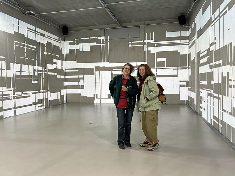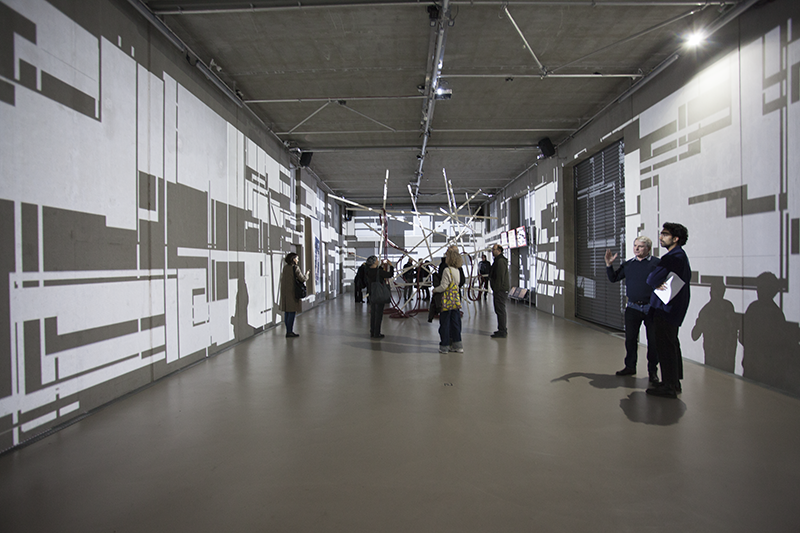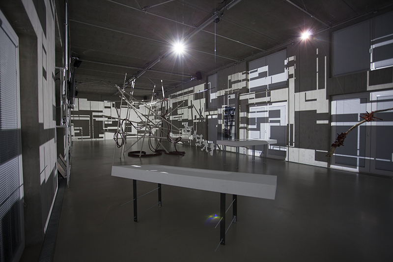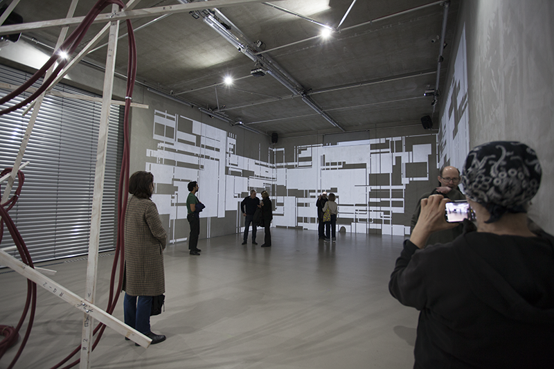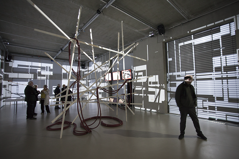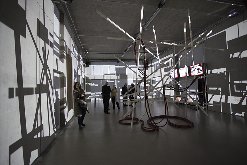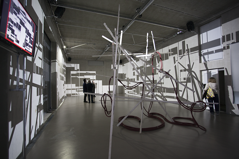 LIA hat die Arbeit vor einigen Jahren an der Fassade eines Museums in Taipeh installiert, wo man allein aufgrund der Blickbewegung von unten nach oben großstädtischen Strukturen assoziiert. Hier im Innenraum werden solche konkreteren Assoziationen (von Schaltkreisen bis zu einem Maschinenraum) beim längeren Hinsehen immer stärker von den wahrnehmungsspezifischen Auswirkungen – wie der Auflösung der Linearität der Bilder bis hin zur Instabilität der gewohnten Raumkoordinaten – abgelöst.