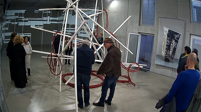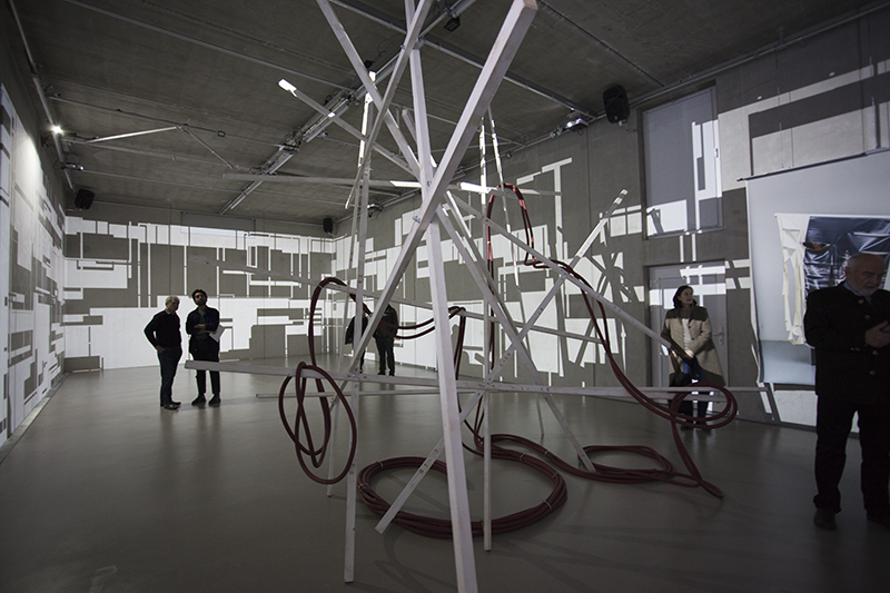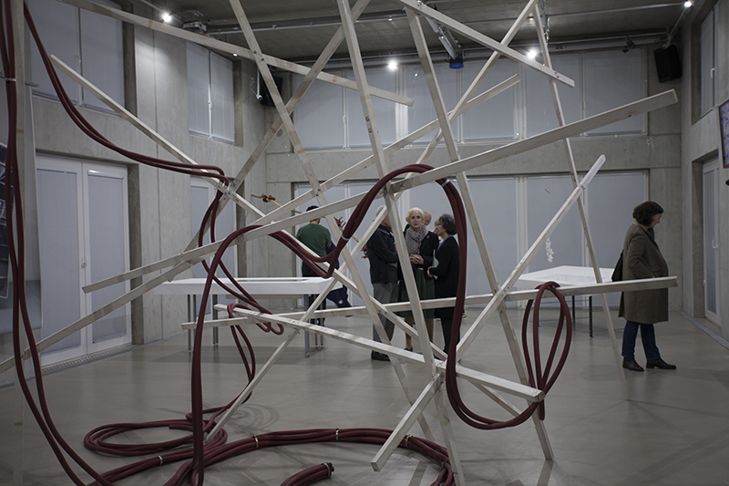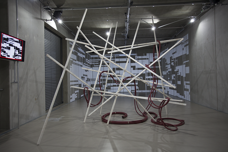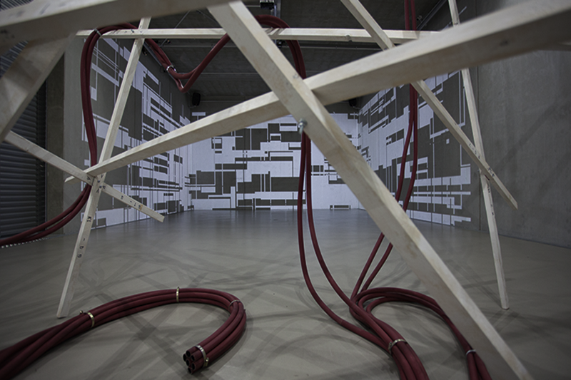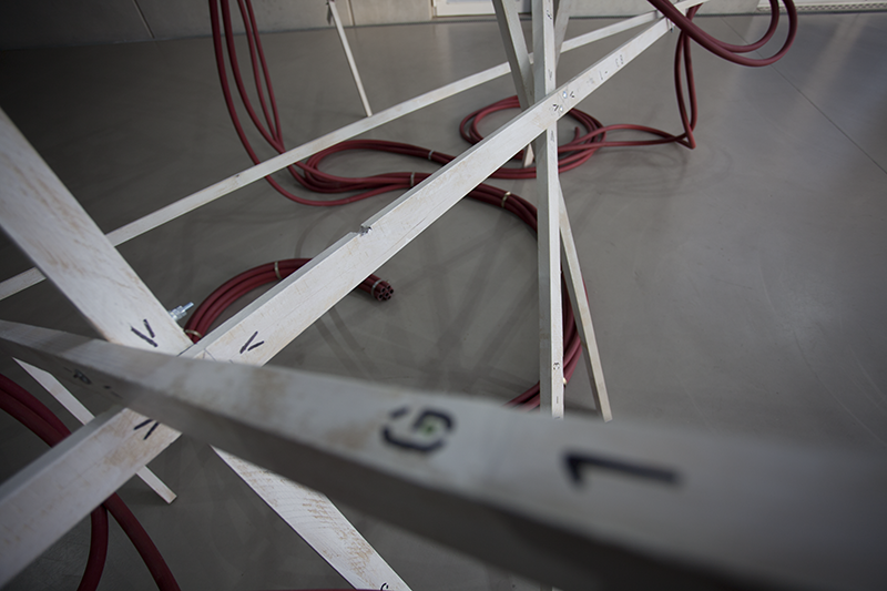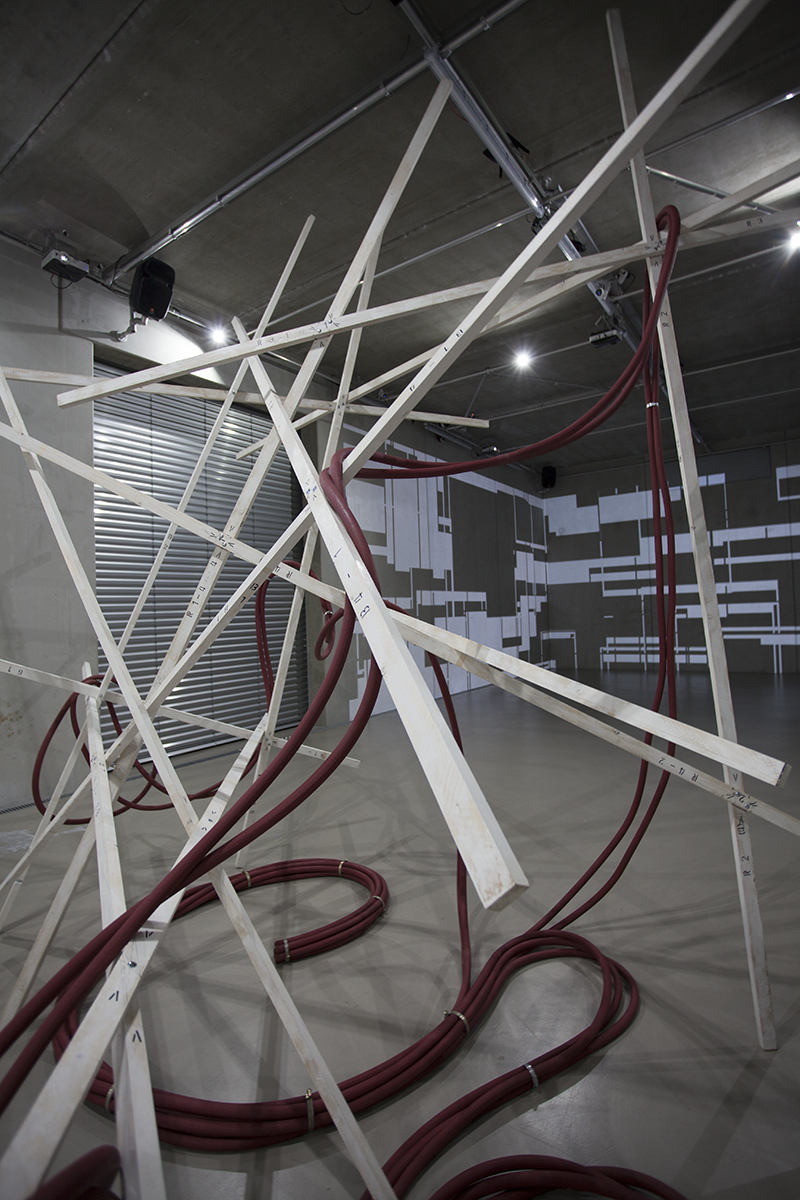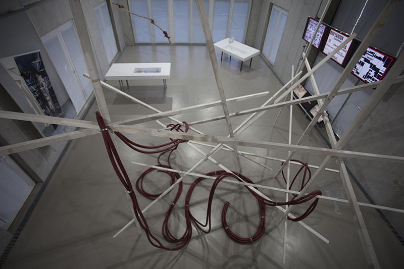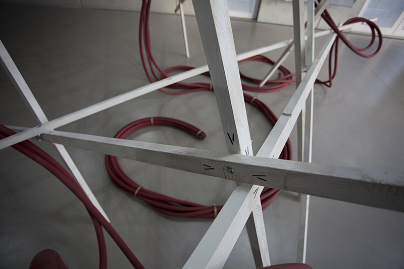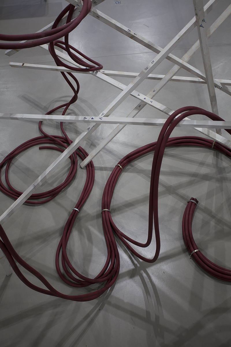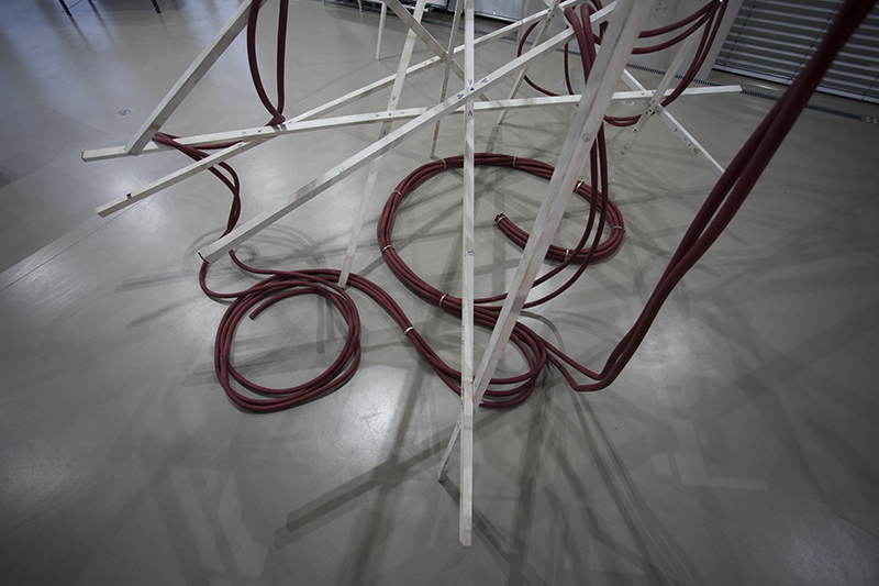 Hung in the Meandering titelt eine weitere Arbeit Tandons, von der man ebenfalls körperlich affiziert wird: Über einer scheinbar wild-chaotischen, scheinbar instabilen Struktur von Holzstäben hängen zusammengezurrte, rote Schläuche, wie sie im Oeuvre von Rini Tandon immer wieder auftauchen. Es ist das Ready-Made-Material, das die Künstlerin interessiert, aber auch die Form der Hülle, die einen fließenden, der Länge nach unbegrenzten Raum –ohne Brenn- oder Bezugspunkt, ohne Innen und Außen, Ein- oder Ausschlüsse – definiert.