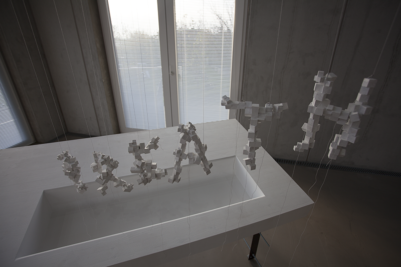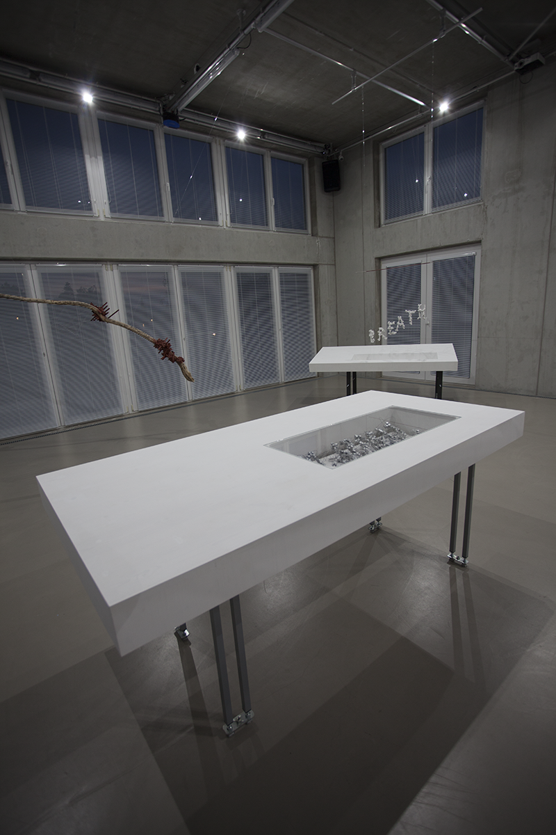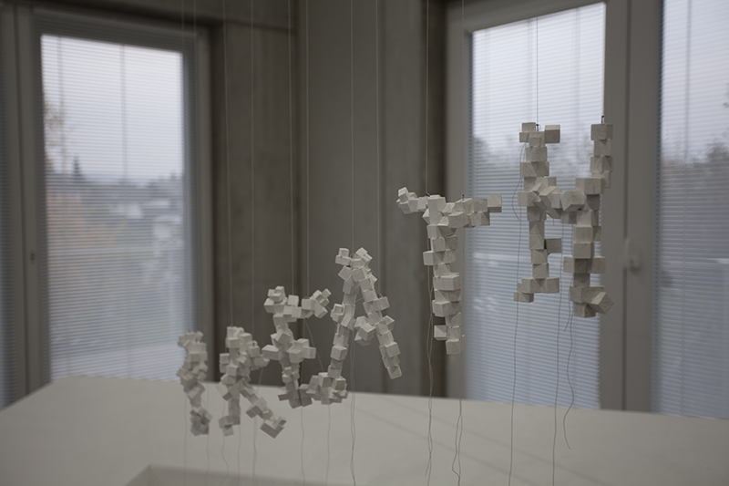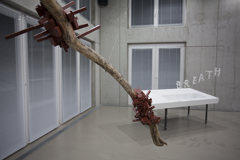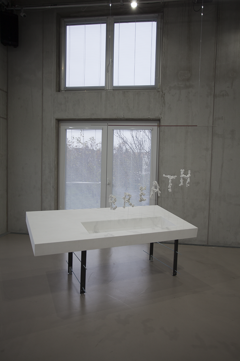 Letzteres ist hier in Form des Wortes „Breath“ materialisiert, es hängt wie eine Art Sprechblase über der Arbeit The Birth of Space. Es ist in Rini Tandons‘s Oeuvre nicht das erste Mal, dass ich mit dem Atem/der Atemluft diesem schwer fassbaren Medium begegne: Breath Field titelte bereits eine Arbeit in ihrer Ausstellung in der Galerie Raum mit Licht 2010. Es handelte sich um eine tischähnliche Struktur, auf der sie eine Plexiglashaube auf einer teils durchlöcherten Platte mit anderen Gegen- und Widerständen in Beziehung setzte. Es ist die Vorläuferarbeit von The Birth of Space, die sich mir 14 Jahre Co2-Austoß später noch einmal neu oder ganz anders erschließt: schließlich ist die Atemluft mittlerweile noch delikater und gerade aufgrund der Verschmutzheit wahrnehmbarer geworden. Liest man das Wort „Breath“ – das durch die Hängung und Materialität eine höchst performative Qualität hat – reagiert der Körper fast automatisch und atmet ein und aus.