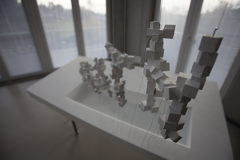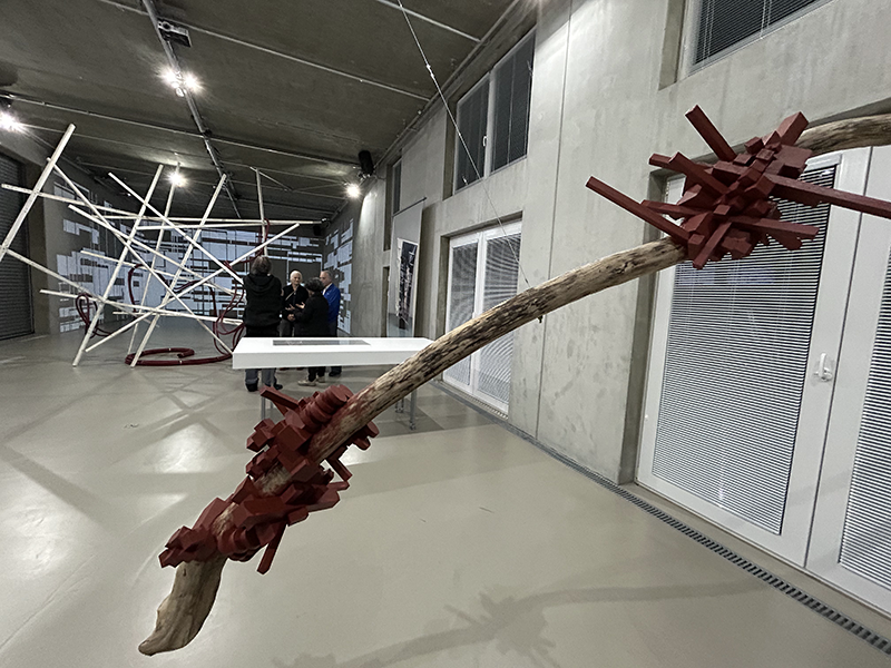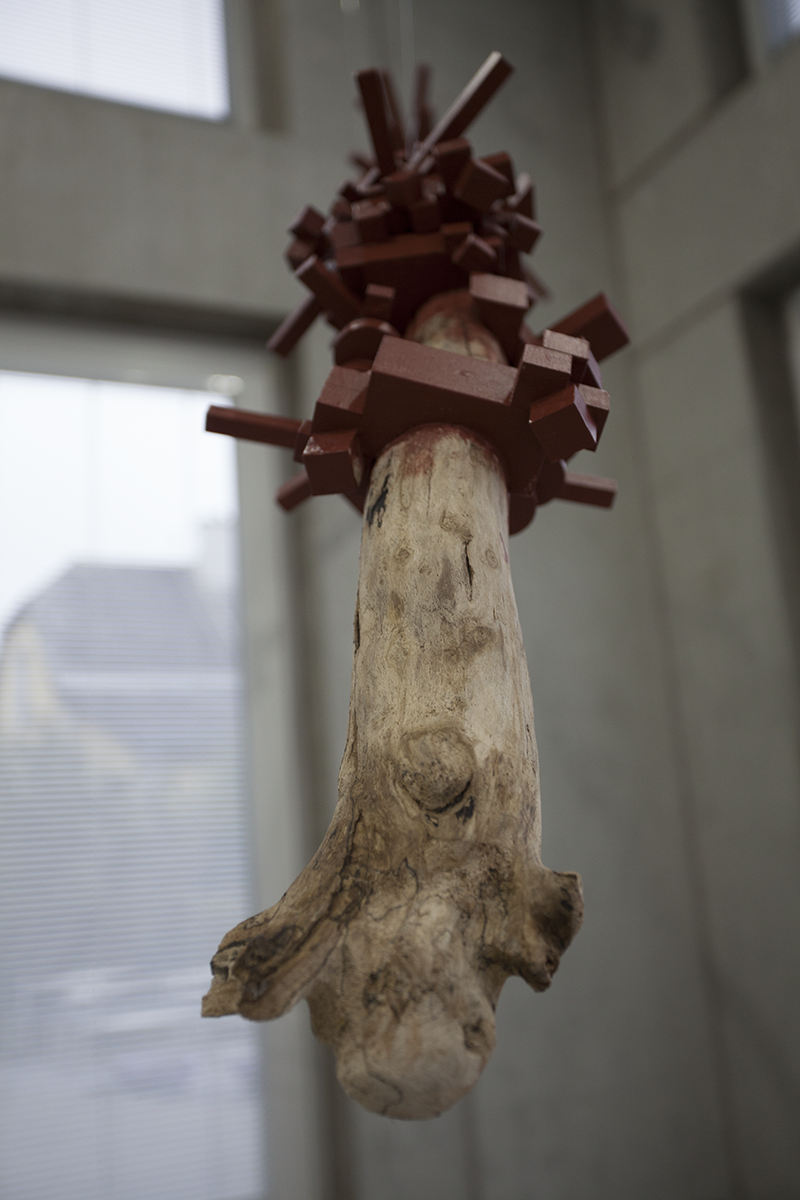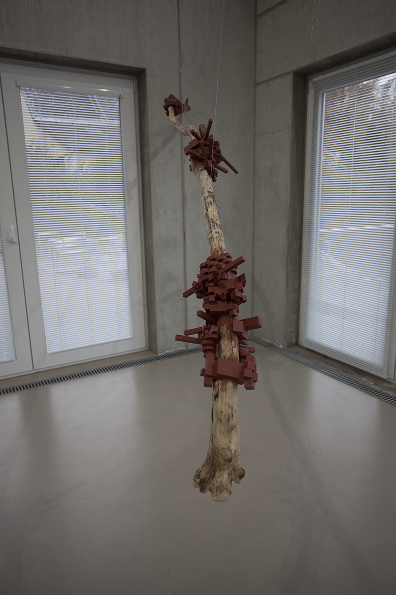 Bei Rini Tandon materialisieren sich diese für Menschen nicht wahrnehmbaren Wellen in Form von Baumstämmen, die an dünnen Fäden hängend den Raum quasi materiell ertasten. Sie wirken als würden sie schweben und weisen an mehreren Stellen parasitäre Strukturen auf – eine Art virtuelle Veredelung, wobei mich die kubischen Wucherungen an Pixel erinnern: So als könnte der Blick hineinzoomen in die materielle, physische Welt, die längst mit dem Virtuellen verwachsen ist.