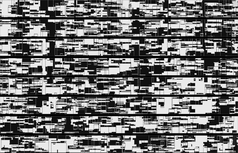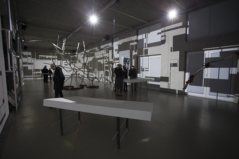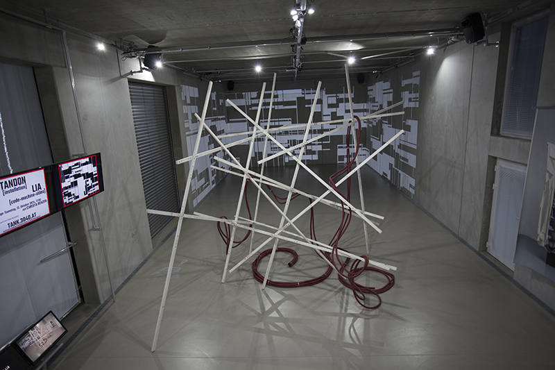 Einen den Raum von den Rändern her betrachtenden Ansatz findet man auch bei LIA, da auch die Arbeit Black or White or More or Less keinen Mittelpunkt hat. Vielmehr wandern die Augen auch im TANK.3040, an den LIA die Arbeit angepasst hat, über unendlich viele, rechteckige weiß-schwarze Flächen, die sich ineinander verschieben und so kaum überschaubare, dezentralisierte Räume aufmachen.