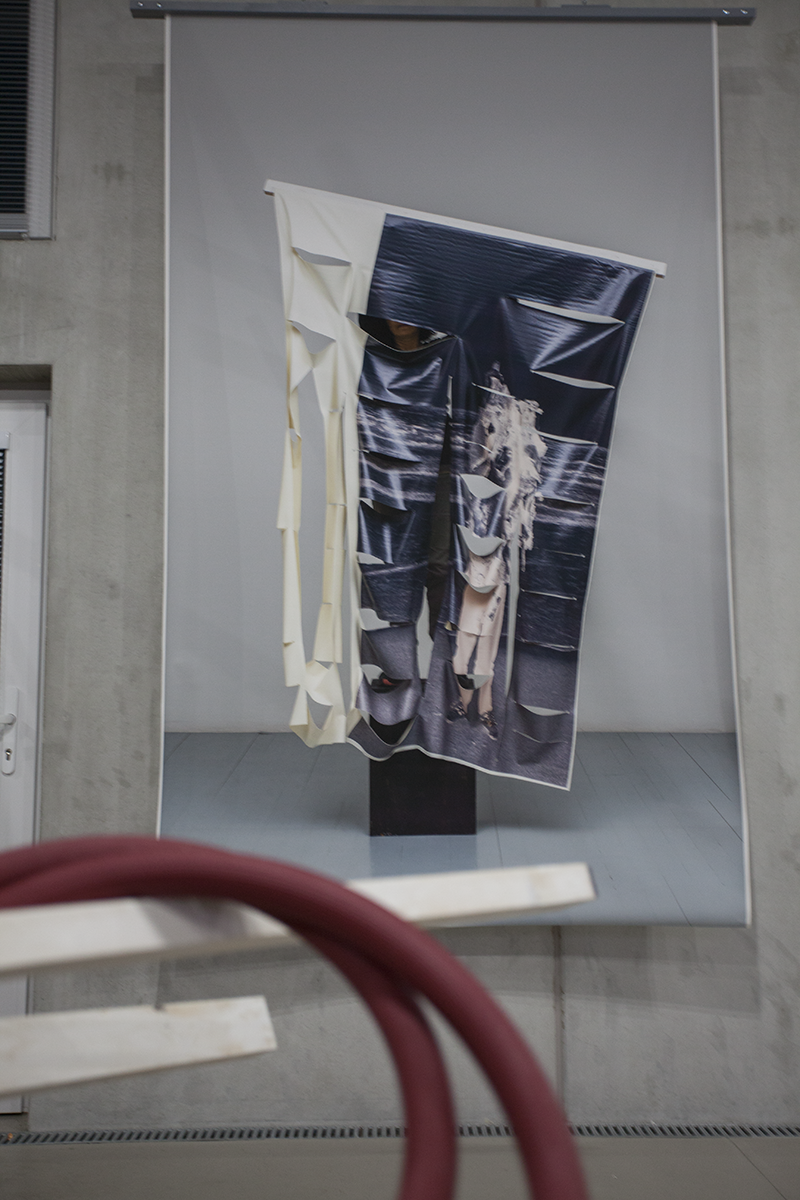 Medialen Transformationen wie diese sind fixer Bestandteil von Rini Tandon‘s sehr überlegter, sich immer wieder selbst befragender Arbeitsweise. Ein weiteres, wiederkehrendes Element in ihrem Oeuvre sind „Löcher“, die stets Durchblicke auf andere mediale Zeit- und Raum-Ebenen ermöglichen: angefangen bei ihren frühen Ausstellungen in der Galerie Insam und einem Loch in der Galeriewand über die roten Schläuche – die wie Wurmlöcher kleine Passagen durch Raum und Zeit bohren – bis hin zu den collageartigen, flächigen Cut Outs.